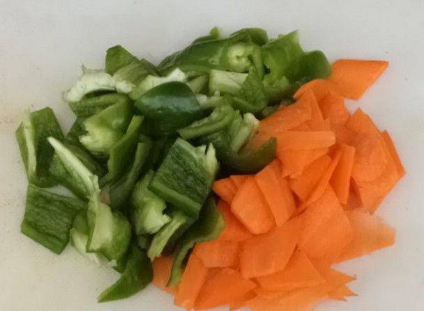 第二步,青椒和胡蘿卜在水裡清洗幹凈後,胡蘿卜去皮後,將兩種食材分別切成片