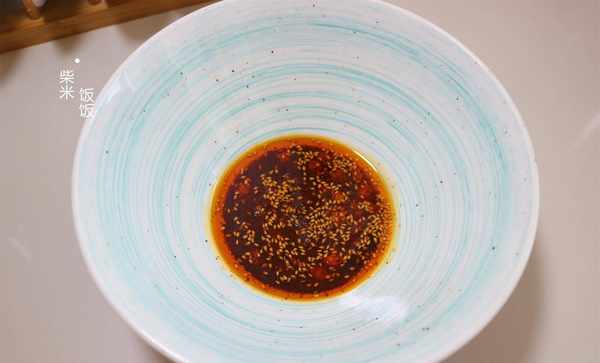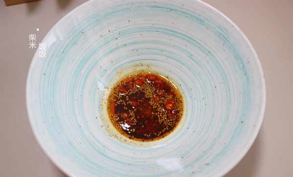 1,大碗中加入1勺辣椒粉、少許五香粉、白芝麻、紅辣椒,澆入滾燙的熱油激發出香味。