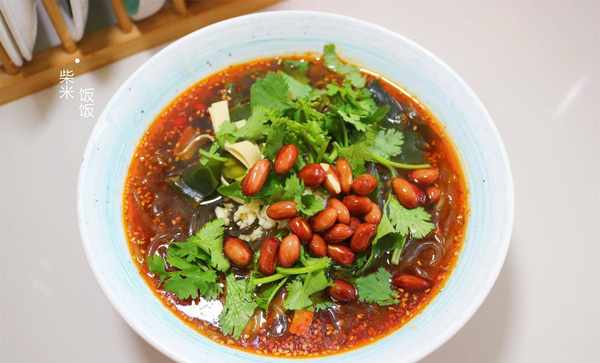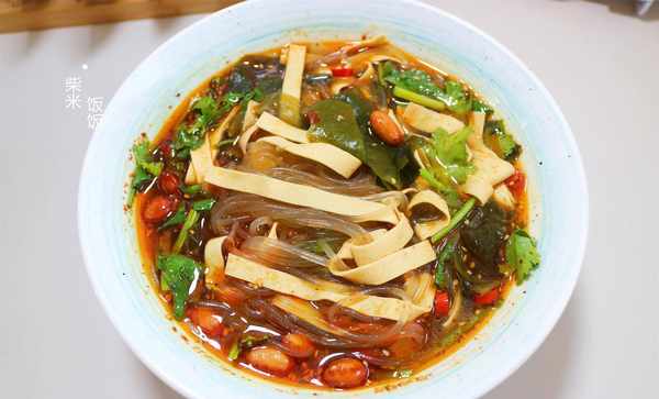 【食材】紅薯粉條、豆腐皮、裙帶菜、香菜、花生米、蒜末、紅辣椒、辣椒粉、白芝麻、生抽、香醋、鹽、五香粉、雞精