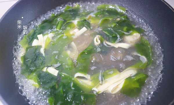 4,接下來放入自己喜歡吃的配菜,我這裡搭配瞭豆腐皮和裙帶菜,再煮1~2分鐘,煮熟關火。
