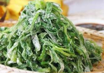 粉蒸面條菜:選擇鮮嫩的面條菜,個人認為小麥地裡的最優質。將面條菜擇洗幹凈,控盡水分。用面粉拌勻,上屜大火蒸10分鐘。取出抖散,加蒜泥、鹽、香油、熟芝麻仁拌勻即可。記住一定要用木柴燒火才好吃,香油要用農村產芝麻做的。這種美味,誰吃誰知道!