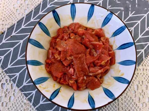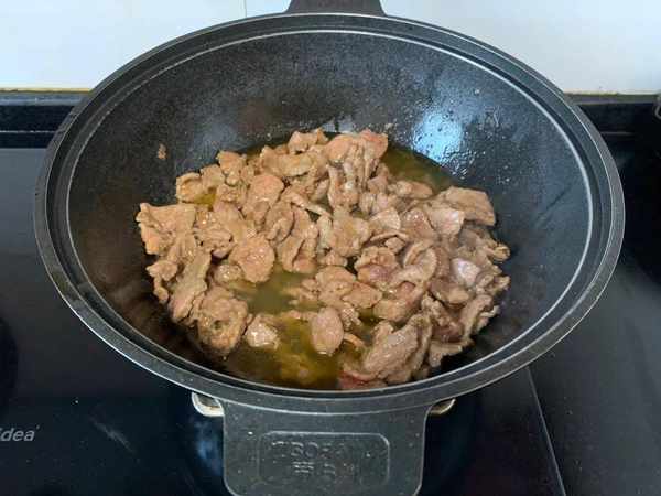 3. 鍋裏下入比平時炒菜多一倍的油,下入醃制好的牛肉,大火快速翻炒成熟後盛入碗中。