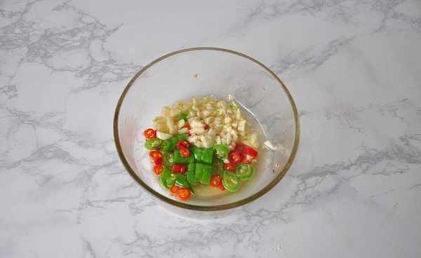 3將蒜與辣椒放在碗中,1小把花椒放在油鍋中燒熱,然後過濾出花椒,將熱油澆在上面。