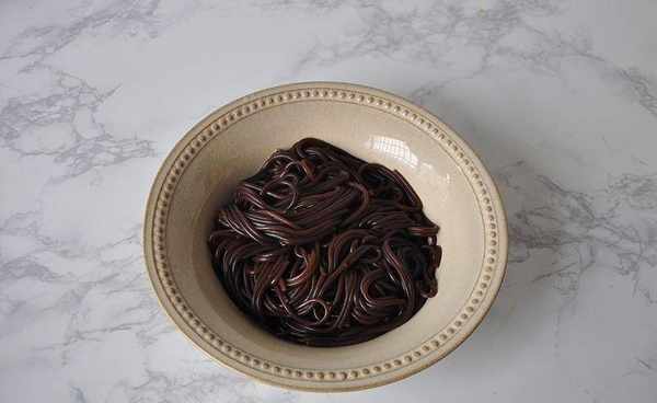 2蕨根粉冷水下鍋,煮至用手能掐斷,撈出投涼備用。或者根據包裝外面的說明控制烹調的時間。