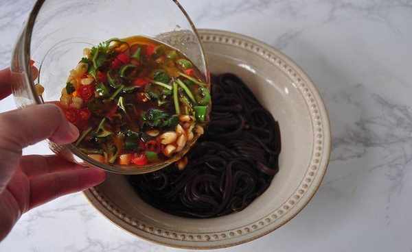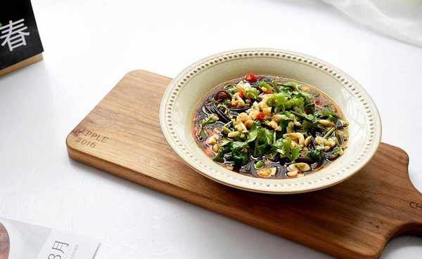 5將調好的料汁澆在蕨根粉上即可。這道涼拌菜的調味汁要比其他涼菜的多些,以稍沒過蕨根粉絲為好,這樣氣質才會濃,口感也更爽滑。