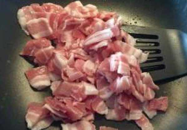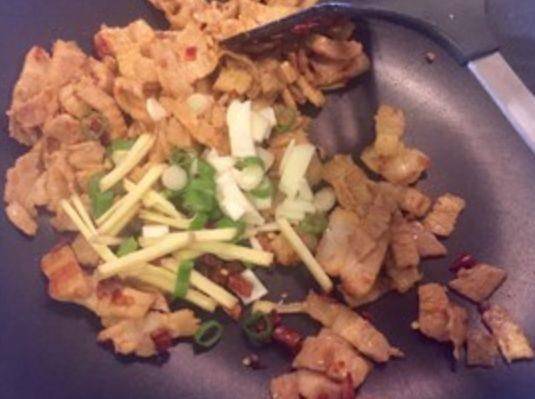 第四步,在炒鍋中放上少許的食用油,開至小火,放入五花肉,進行煸炒,炒至水分都出來,肉開始變得時尚,邊邊也開始往上卷起的時候