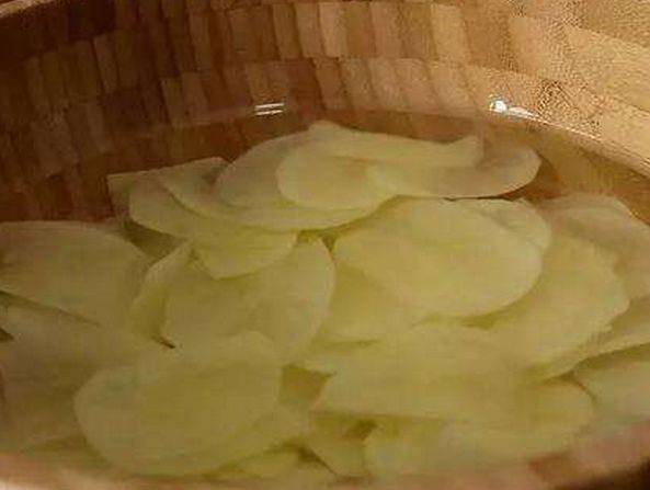 第二步,土豆清洗幹凈後,剔除有黑點的地方,用刮皮刀削掉皮,然後切成薄薄的片,在水中浸泡一會,撈出來瀝幹水分