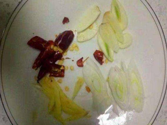 第三步,大蔥切成片,蒜切成片,薑切成絲,幹辣椒切成小段