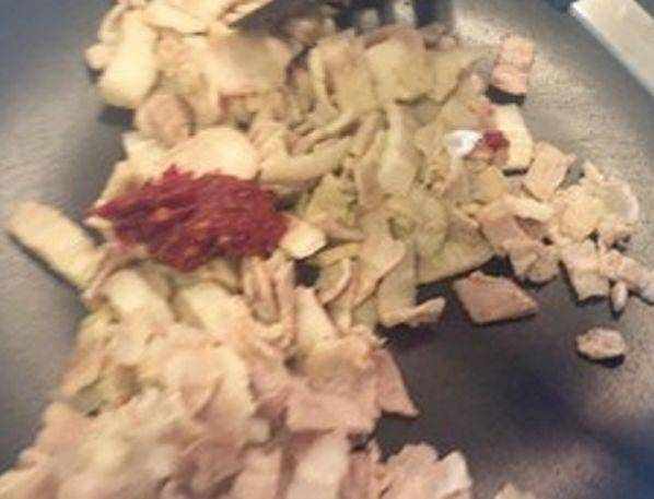 第五步,放入半勺的豆瓣醬,翻炒均勻,將紅油炒出來