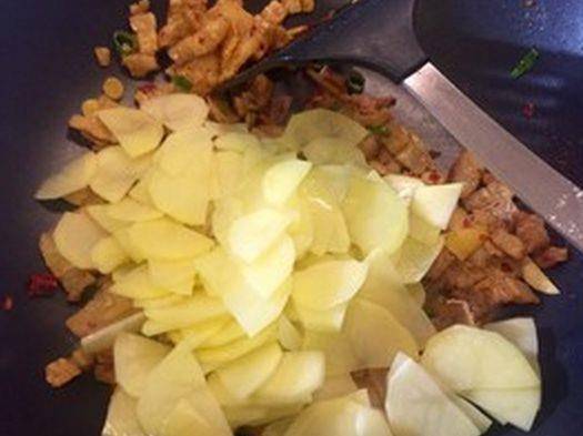 第七步,倒上土豆片,加上一點食鹽和糖,開大火炒熟