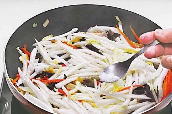 5加入白菜絲,調入鹽、蠔油、生抽、白糖,大火炒至白菜變軟。