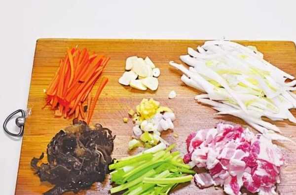 2胡蘿卜切絲,白菜幫切絲,芹菜梗切段,五花肉切薄片,黑木耳切小朵,蔥、薑、蒜切碎。