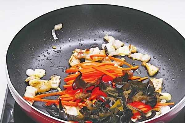 4加入蔥、薑、蒜碎炒出香味,放入胡蘿卜絲和黑木耳。