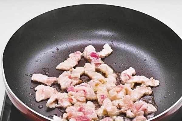 3炒鍋燒熱,放入少許油,加入五花肉片,用小火煸炒至出油。
