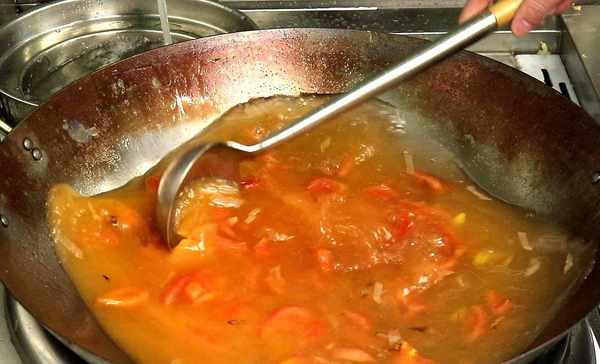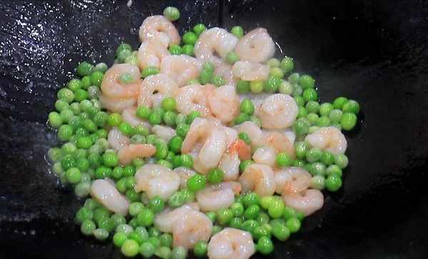 3.鍋內燒油,油溫5成熱時把控過水分的蝦仁、豌豆,和剛剛準備好的料汁一起倒入鍋中,開大火顛鍋翻炒,食材入味、香味融合以後即可出鍋。