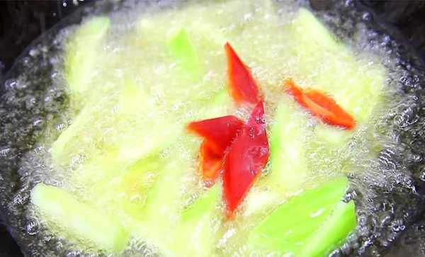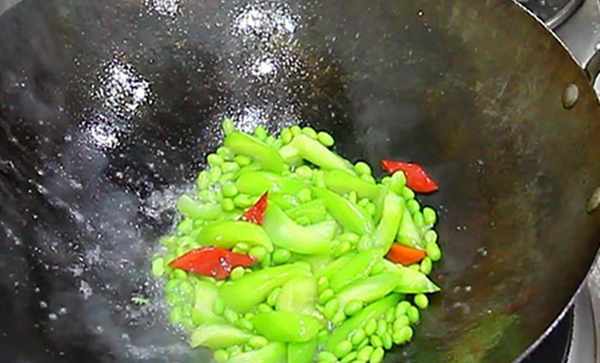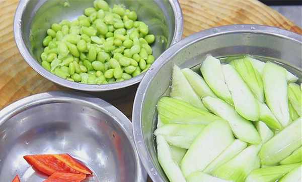 2.鍋內燒水,放入蠶豆,焯水片刻撈出水面上的豆皮和浮末,蠶豆焯熟以後撈出來,快速用涼水沖一下;鍋內再燒水,大火燒開以後放入絲瓜和紅椒,焯燙30秒鐘,絲瓜返青以後撈出沖洗,保持清脆。