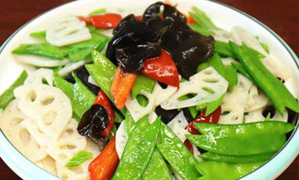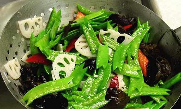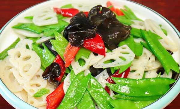 1.荷蘭豆掐去兩頭,隨便把老筋一起扯掉,用清水洗幹凈;蓮藕去皮後破開、切成薄片;紅椒、胡蘿卜都切成菱形片用來配色;木耳泡發、撕成小朵;碗中放入食鹽、味精、白糖、雞粉、淀粉、芝麻香油,用清水化開調成碗料,方便一會快炒出鍋。