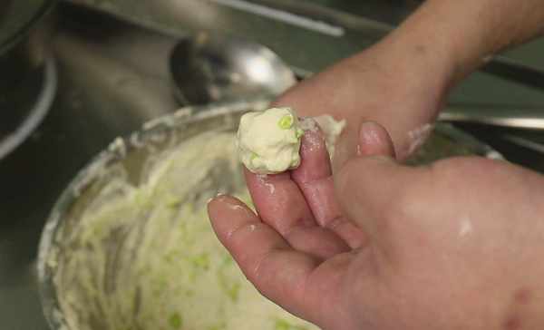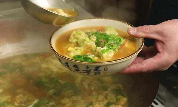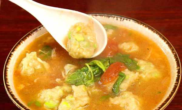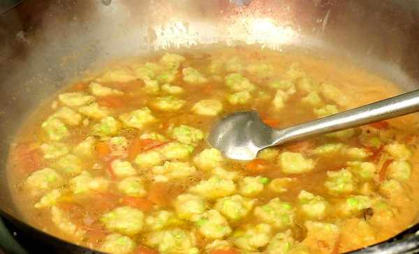 3.湯汁燒開以後,我們開始下青豆丸子。抓一把餡料,在虎口處擠成丸子放入鍋中。水不要過於沸騰,讓丸子在鍋中慢慢定型。下丸子的時候要經常搖晃鍋,以免糊底。
