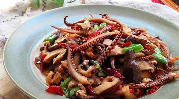 材料:魷魚須150克、青椒1個、紅幹椒5個、香菇50克、蒜粒4粒、生薑3克、蔥2棵、黑椒粉少許