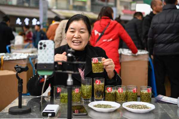 上午9點,交易市場的人流量達到瞭頂峰。茶商們接踵摩肩,詢價聲此起彼伏。市場的一隅,一對中年夫妻正用手機進行直播帶貨。妻子的面前,10杯蒙頂甘露一字排開,她繪聲繪色地描述著茶葉的特點。這天早上,不到2平方米的臨時直播攤在短短幾個多小時裡賣出瞭8000多元的蒙山茶。