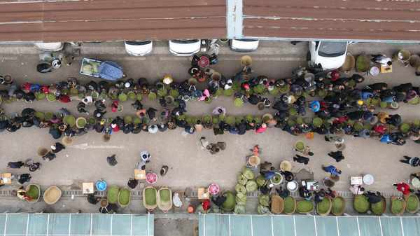 雅安市名山區雙河鮮葉交易市場內,茶農與茶企在進行鮮葉交易(無人機照片)。新華社記者 胥冰潔 攝