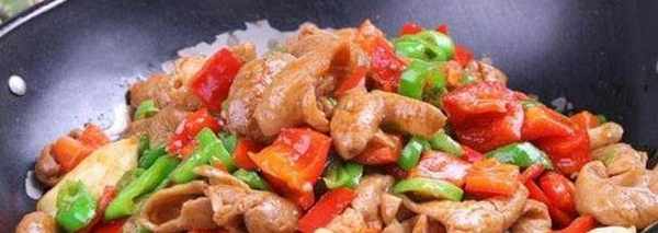 2.炒鍋燒熱加入花生油,加入五花肉片,煸至出油,將多餘的油取出;加入幹辣椒節和大蔥片爆香,加入青尖椒片和圓蔥片煸炒;下醬油熗炒,加腐竹,調入蠔油翻炒入味,淋香油出鍋即可。