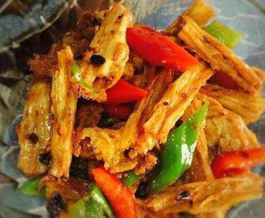 材料:豬五花肉150克;浸泡好的腐竹400克;青紅尖椒50克;圓蔥50克;蔥片10克;醬油10克;幹辣椒節2克;花生油10克;蠔油適量;