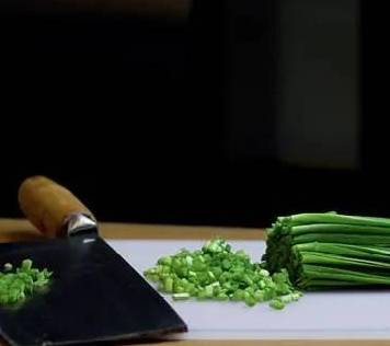 3、切韭菜的時候可以將韭菜整理齊,用手握住不讓其散開,用刀均勻切小段就可以瞭,簡單又方便。