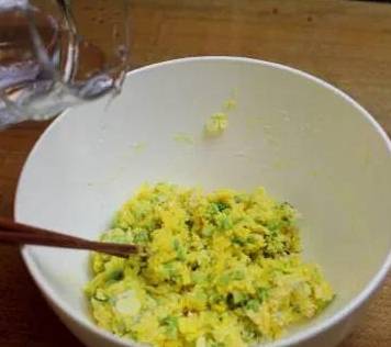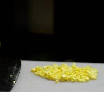 5、然後加入切好的韭菜段和玉米碎,放入1小勺鹽。