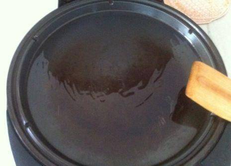 第四步,電餅鐺稍微預熱一下,抹上油,待油燒熱後,將裹好面糊的香蕉片,一個個的擺放上去;