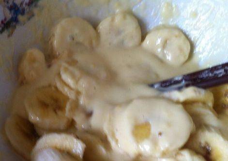 第三步,切好的香蕉片放在攪拌好的雞蛋面糊中,讓每一片香蕉上面,都能夠均勻的裹滿面糊;