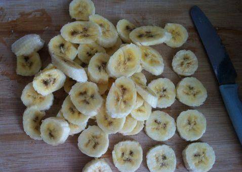 制作過程:第一步,香蕉準備好之後,剝掉皮,果肉放在案板上面,切成薄厚適中的片;