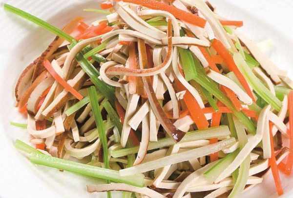材料:香幹200克,西芹100克,胡蘿卜50克,精鹽、味精、雞精各1/2小匙,白醬油、香油各1小匙,植物油2小匙。