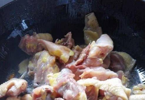 第四步,炒鍋預熱後,加上食用油,放入蔥段和薑片爆香,放入雞塊翻炒,待炒至雞塊變色後,將裡面的水分吸幹