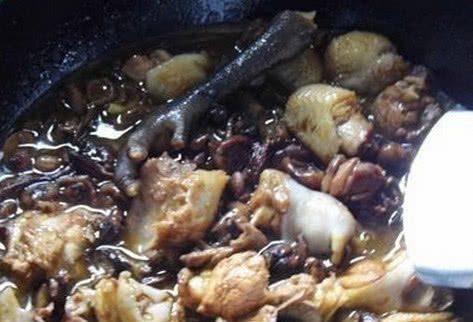備用食材:土雞1隻,榛蘑200克,老抽2個,鹽1勺,小蔥1根,薑1塊,八角3個,料酒1勺,桂皮2個,植物油3茶匙