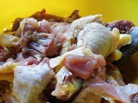 第二步,雞做好準備工作,沖洗幹凈後,清洗內臟並出去雞身上的雜毛,剁成塊,清洗幹凈,瀝幹水分