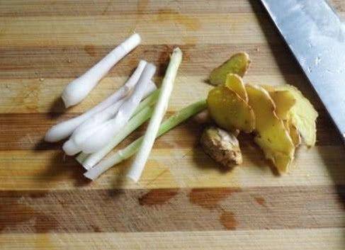 制作過程:第一步,把準備好的小蔥清洗幹凈後切成段,生薑切成片