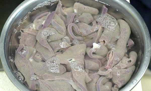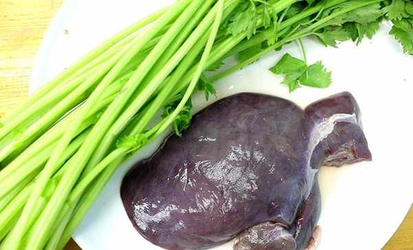 2.準備一個鮮豬肝,打掉上面的筋膜後斜刀切成片,然後用清水多淘洗幾遍,一直洗至水非常清澈才可以,充分去除裡面的血水,否則有腥味。五花肉一小塊,去除肉皮後切成片,五花肉片主要用來增香,可放可不放。