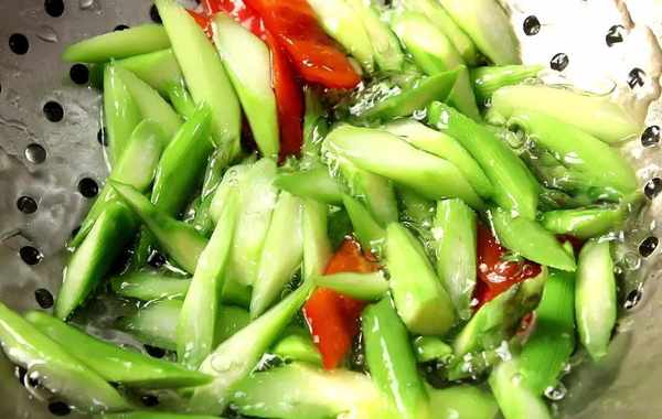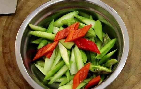 3.鍋內燒水,加入少許食鹽和植物油,水燒開後倒入切好的蘆筍、紅椒,大約焯水20秒,蘆筍斷生返青以後倒出,用清水沖洗、冷卻備用,清水沖洗能使蘆筍色澤更加青翠。