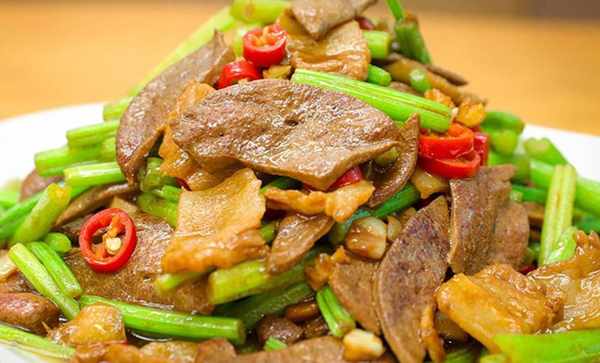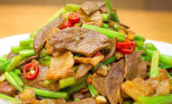 5.然後芹菜段、紅椒圈,繼續大火爆出鮮辣味,再勾入少許水淀粉,讓調料更好地吸附在豬肝表面,翻勻後即可出鍋,鮮香滑嫩的芹菜炒豬肝就做好瞭。
