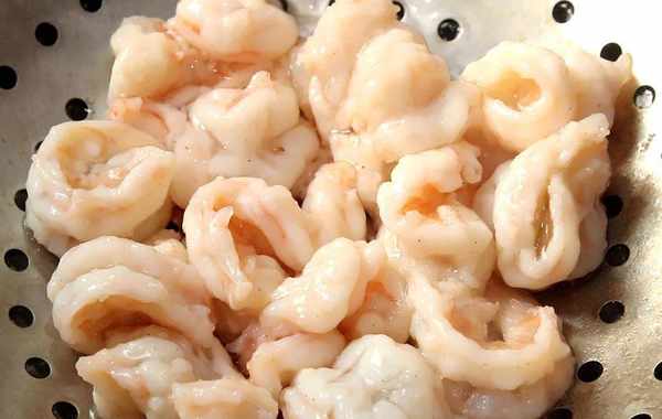 4.鍋內再燒水,加入少許食鹽和植物油,水燒開以後把蝦肉下入鍋中,快速焯水30秒,蝦肉微紅打卷以後撈出,用清水沖洗幹凈備用。