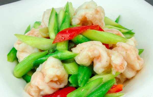5.鍋內燒油,油燒熱以後倒入蔥、薑爆出香味,倒入蘆筍和蝦仁翻炒均勻,從鍋邊淋入少許清水,加入食鹽1克,胡椒粉1克,開大火快速翻炒給食材入味,再淋入少許水淀粉,讓調料更好地粘附在食材上,再淋入少許明油提亮色澤,翻勻後即出鍋裝盤,美味即成。