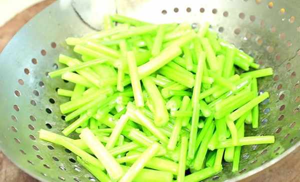3.鍋內燒油,油燒熱以後放入芹菜段進行煸炒,加入一勺食鹽,少許味精調味,開大火把芹菜炒至六成熟,倒出來備用。