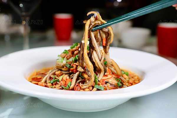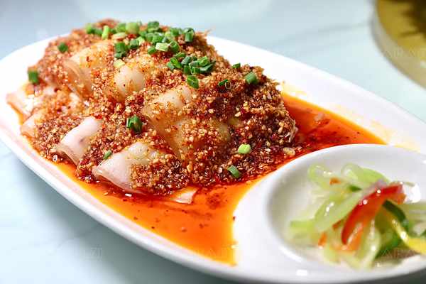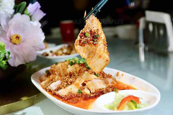蒜泥白肉,取300斤土豬的二刀肉部位,煮熟切薄片,淋上紅油、蒜泥等涼拌,蒜香濃鬱,肥而不膩、瘦而不柴,是一道令人胃口大開的開胃涼菜。