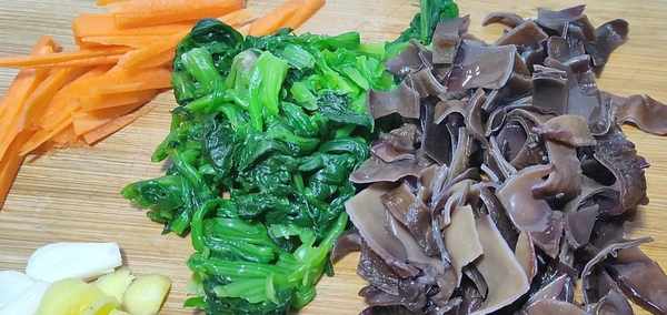 準備少許胡蘿卜,切成胡蘿卜片,再切成胡蘿卜絲;菠菜也要簡單切幾刀,切短一點,更方便小孩吃;木耳同樣也要切成小塊,薑切片,蒜切片,備用。