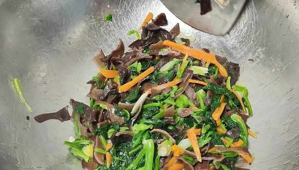 往鍋裡倒適量油,先下入薑片、蒜片和胡蘿卜絲,一起用小火煸一下,然後倒入木耳炒上一分鐘後,再倒入菠菜炒均勻,再倒入前面調好的生粉水勾一下芡,開大火翻炒收汁,收汁濃稠就可以出鍋。
