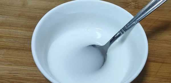 準備一個幹凈的小碗,裝少許清水,加入適量鹽、小半勺生粉混合均勻。