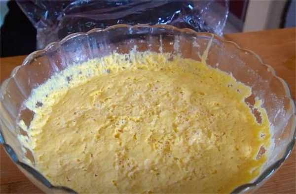 1.這個玉米面咱們放150g,白面放75g,放上10g的白糖,再來3g的酵母粉,然後用290毫升的溫水開始和面,最後攪拌成這樣的稀稠度就可以瞭,上面封一層保鮮膜,放在溫暖的地方發酵。