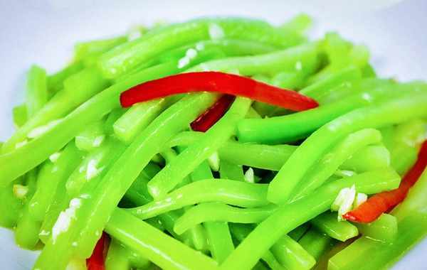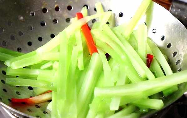 2.鍋內燒水,加入食鹽和植物油,水燒開以後把萵筍、紅椒絲倒入鍋中焯水20秒鐘,萵筍斷生後倒出來用清水沖洗幾下,控水備用,清水沖洗能使萵筍口感更脆。