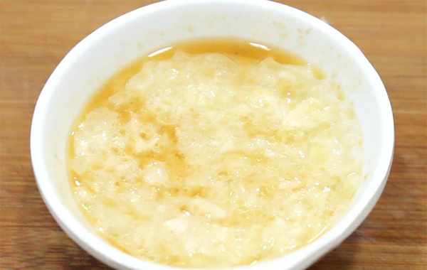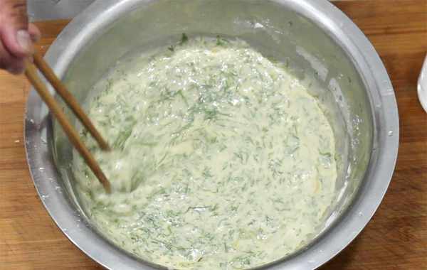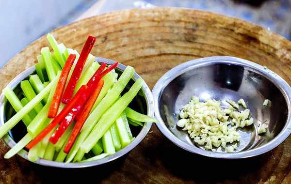 1.準備洗凈的小茴香一小把切碎,大蒜一把放入蒜臼中,加入少許食鹽,防止搗蒜時打滑,把大蒜搗成蒜泥,盛放在小碗中,加入香油3克,涼開水少許,攪拌均勻備用。